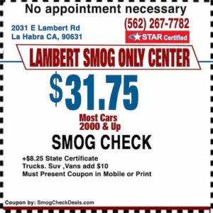 Lambert Smog Only Center is STAR Station and can smog check all vehicles from cars, trucks, SUVs, motorhomes, and even diesels! We certify all DMV smog inspection, STAR smog check, Smog test, smog checks, smog inspection, smog certification, smog testing, Test only smog check, Out of state vehicle registration, Diesel smog inspection, Registration renewal smog inspection and Gross polluter certification, smog checks and smog testing by an experienced smog technician. We Offers free electronic smog certificate transfer to DMV included in smog test coupon.